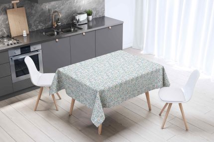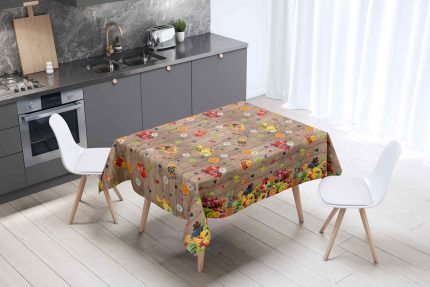 - Multipurpose PVC tablecloth with smooth shiny finish is waterproof / water resistant material and tablecloth can be used for tables indoors or outdoors in the garden. It’s basically oilcloth wax tablecloth surface, so you can lay out food on it and nothing wouldn’t seep through. Once you are done – just wipe it off. Tablecloth is not stain resistant